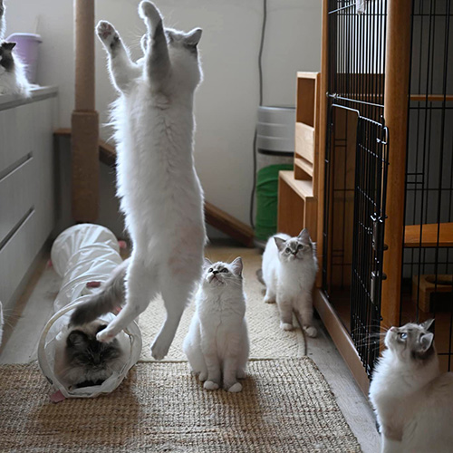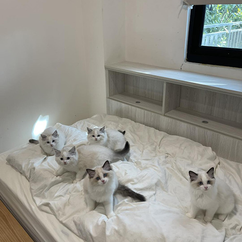 每胎貓咪都有各自房間,並有24H冷暖空調,每間備有除濕清淨機,主食為全肉食,並控制貓咪數量避免多貓家庭的傳染性疾病。